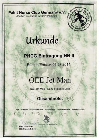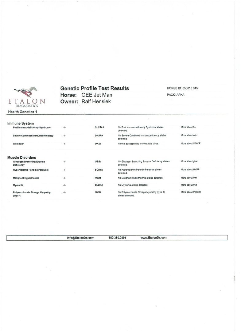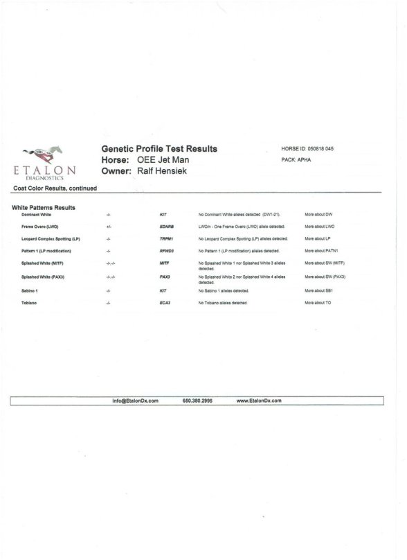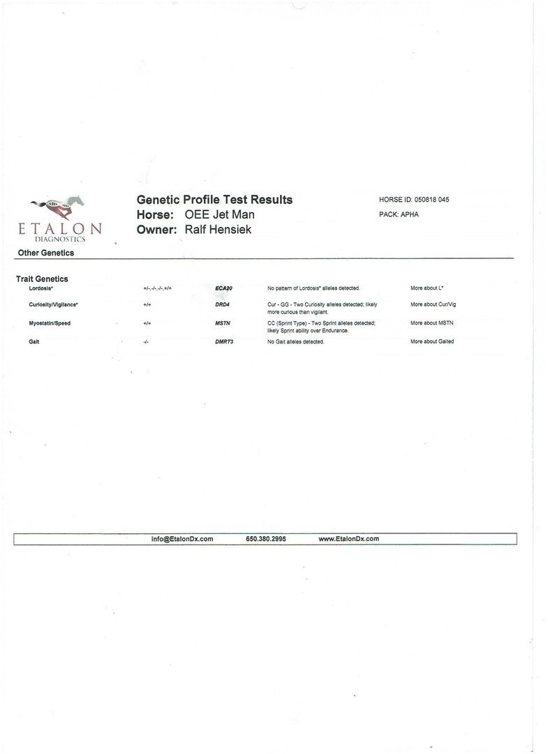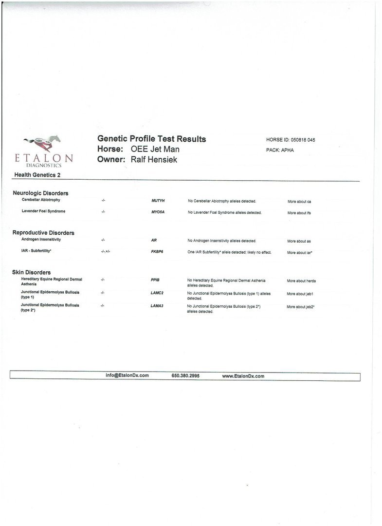 Als bay overo Hengst hat Jetli ein Stockmaß von 150 cm. Er ist genetisch getestet und weist folgende Ergebnisse auf: Mh N/N, PSSM N/N, Herda N/N, Gbed N/N, Owls N/Owls und Imm/MYHM N/N.